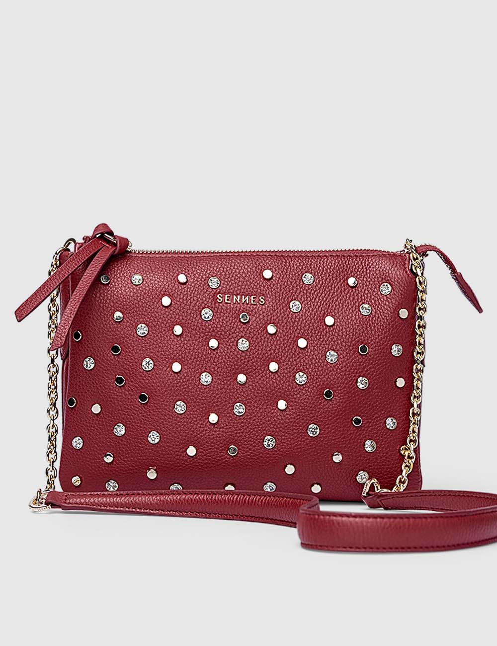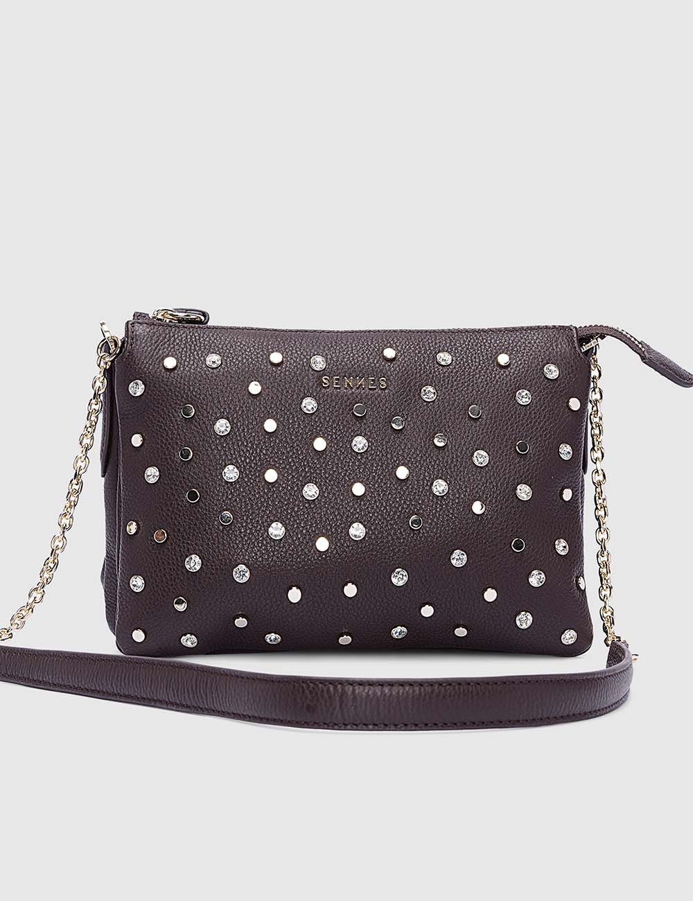 In top-grain Etrograiny leather featuring shimmering golden and diamante studs, the “Confetti” sling bag exudes refinement. With dual compartments, it offers ample space for efficient storage. Its unique strap has a combination of golden chain with leather, adding exclusivity, complemented by a sleek leather puller for added elegance.