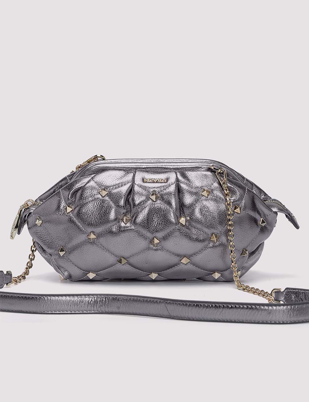 Crafted from the radiant Metallic leather, "Fiesta" is a total showstopper! Adorned with shimmery golden studs, complementing its delicate hand-quilting, it has a sleek detachable leather strap and a single main compartment with an inside mini-pocket. Its glamourous metallic exterior catches light, ensuring you sparkle in any setting.