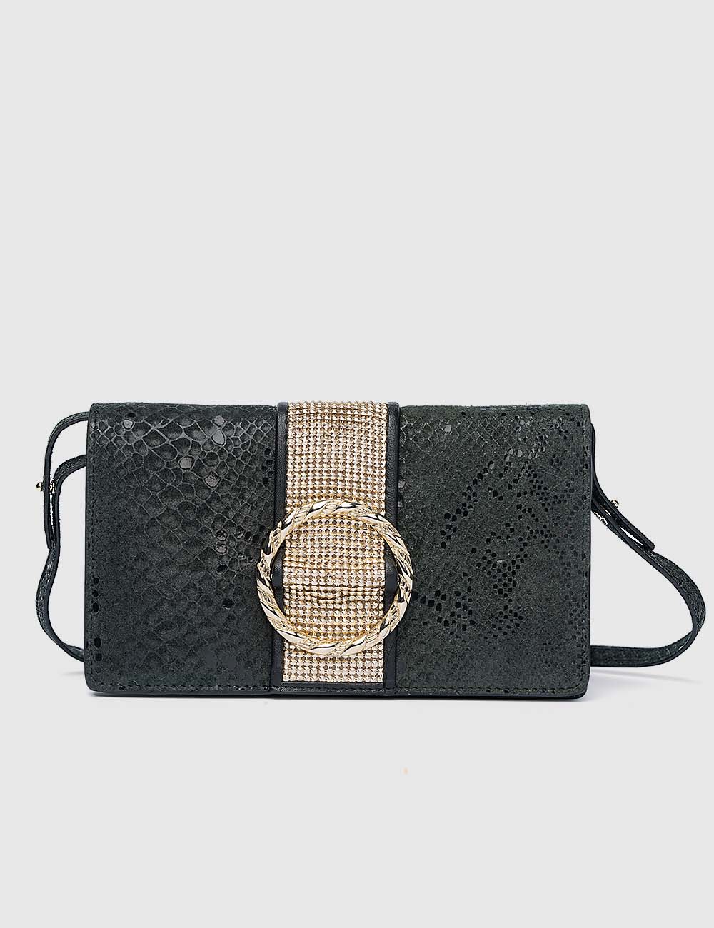 Crafted from shiny metallic leather, the stunner piece, ‘Unico’ comprises of a magnetic closure flap layered with shiny metallic embellishments and a designer circular buckle at its front. With a sleek detachable leather strap, it seamlessly transitions from a chic clutch to a stylish sling bag. Perfect for a day or evening of glamour.