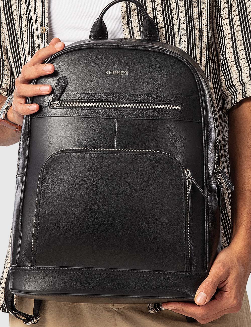 The ‘Vigoroso’ backpack is a class-apart in style and convenience. It’s smartly designed zippered compartments provides extensive storage capacity for your essentials. The silver zippers contrast elegantly against the dark Buff Austin leather, that adds a touch of sophistication. With soft shoulder straps and a sleek top handle, ‘Vigoroso’ offers comfort & luxury.