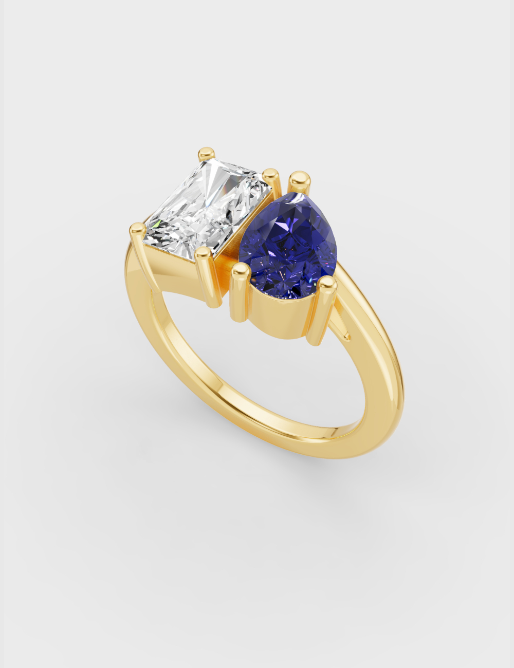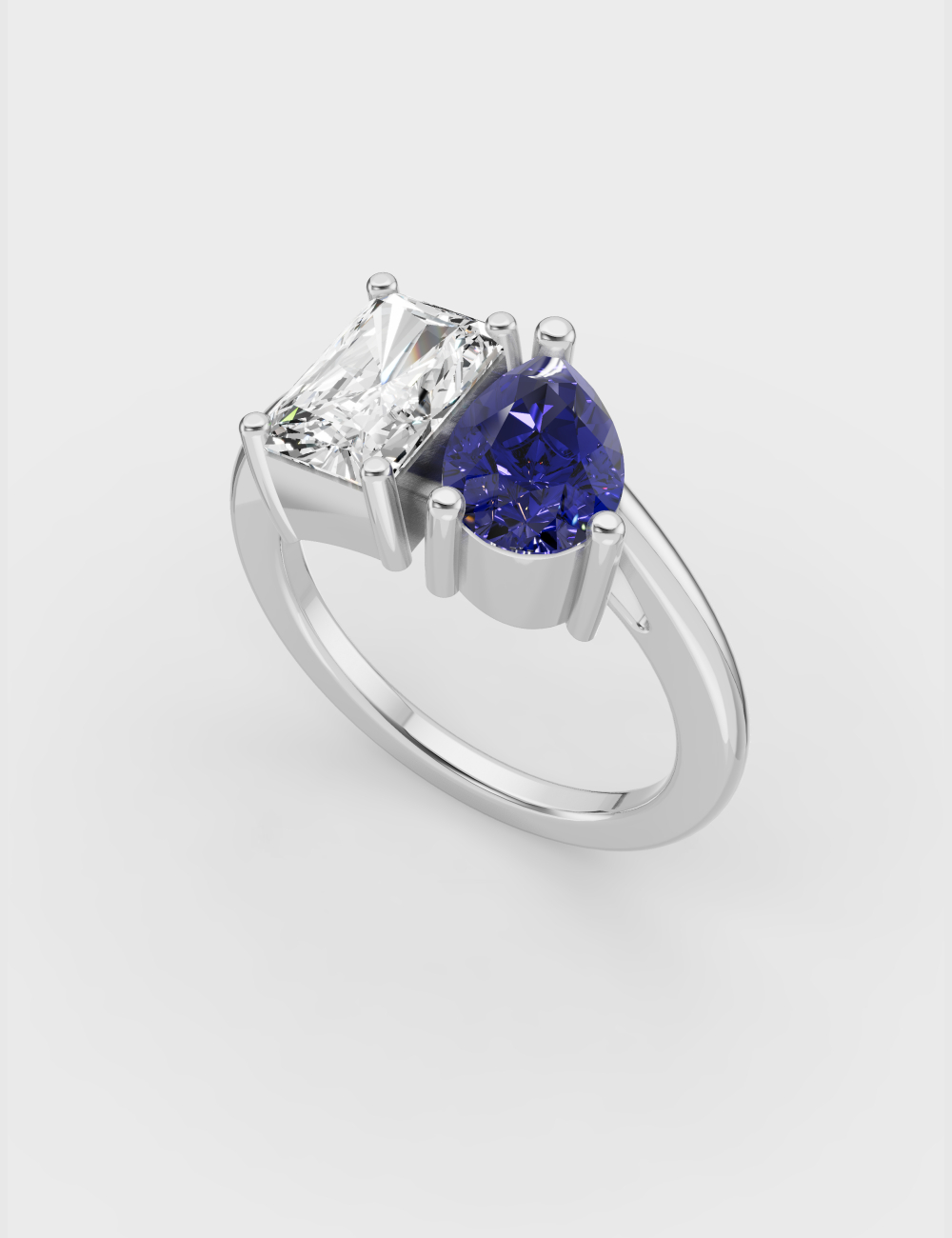 Modern and sophisticated. This 1.3-carat diamond ring features an emerald-cut and a pear-shaped diamond, a statement piece for the modern woman.