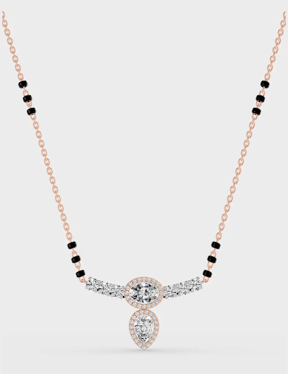 Dress up your tradition with this modern and radiant diamond mangalsutra, featuring a stunning pear-shaped drop beneath a brilliant halo centrepiece. Accented with exquisite-cut diamonds, it beautifully unites timeless tradition with contemporary elegance.