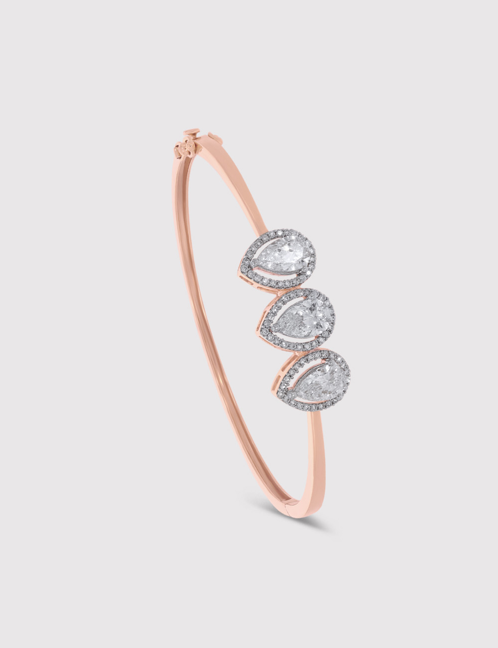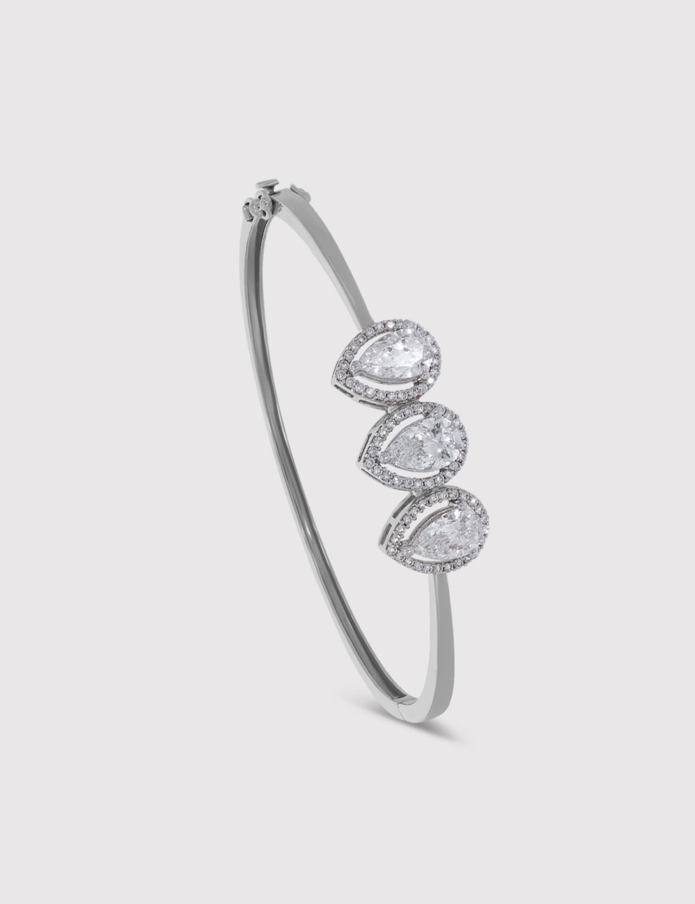 Make an unforgettable statement with this bracelet, where three pear-cut diamonds glow within halos of brilliance. A true showstopper, crafted to shine at soirées and unforgettable celebrations.