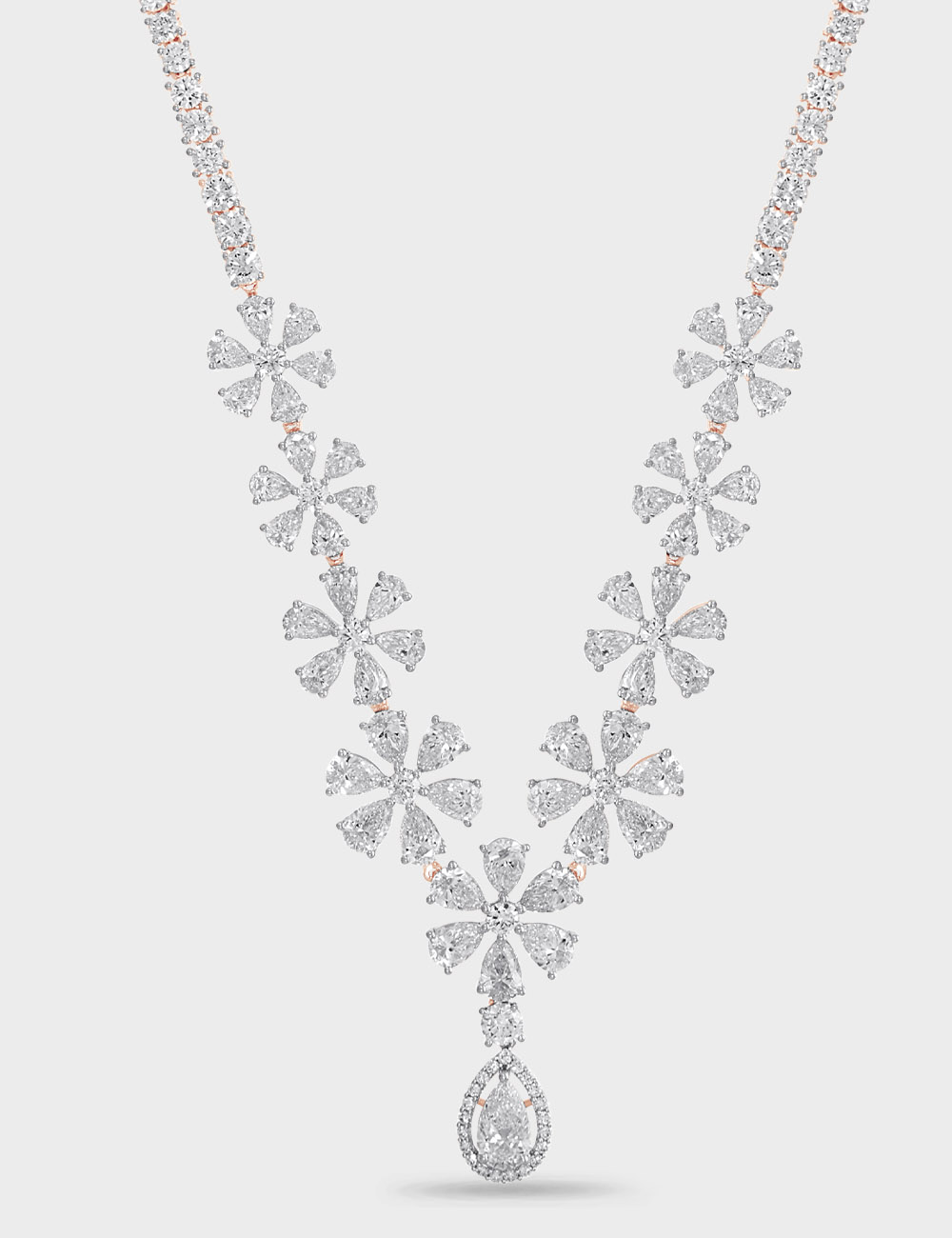 For the days you want to feel beautifully unstoppable, this petal-cluster diamond necklace brings sculpted sparkle and fluid movement through its thoughtfully layered pear-cut diamonds. Slip it on and step into the version of yourself you love most.