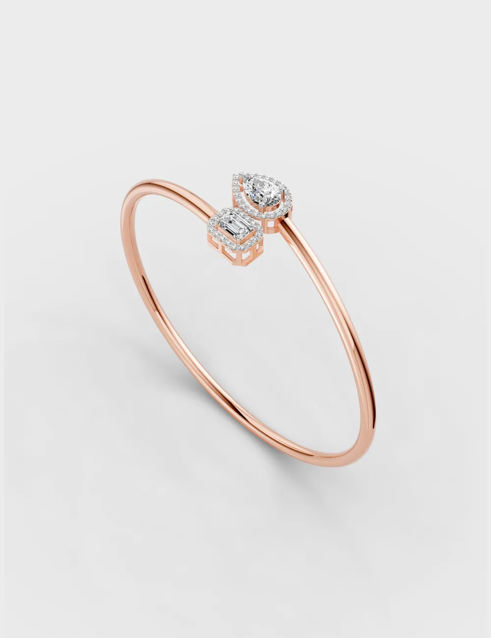 Make a bold impression with this stunning diamond bangle, featuring a captivating pear-shaped and an emerald-cut diamond in a flowing silhouette. Effortless elegance, reimagined for your wrist.