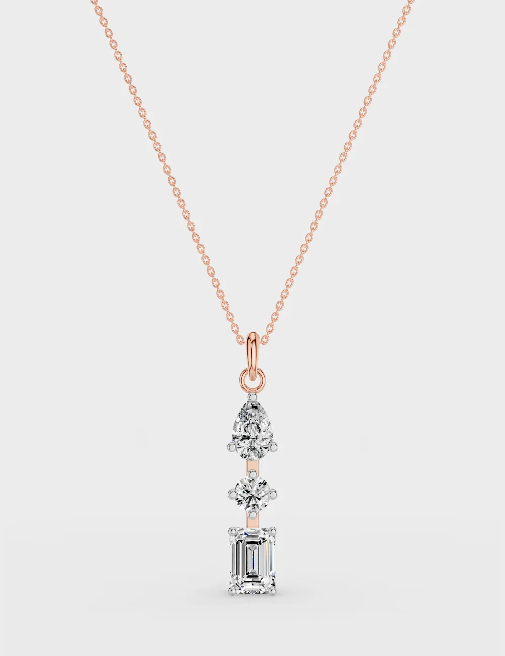 Celebrate your moments with pieces that sparkle with meaning. This chic pendant showcases a trio of pear, brilliant, and emerald-cut diamonds in a sleek vertical drop. Minimalist yet striking, it’s perfect for everyday elegance or evening glamour.