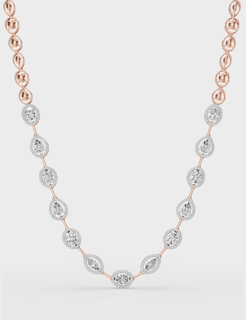 Adorned with 8.09 carat alternating oval and pear-cut diamonds, this breathtaking piece features uniquely shaped solitaires that form a radiant and unforgettable centrepiece, perfect for elevating any ensemble.