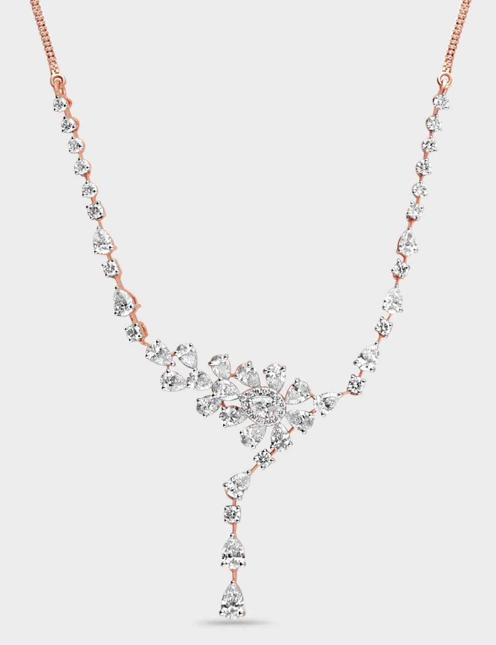 Effortless sophistication begins here, the ultimate expression of modern grace, sculpted into a fluid V-shaped diamond necklace. Shimmering diamonds form a delicately balanced floral drop, creating a timeless accent for soirées, celebrations, and cocktail evenings.