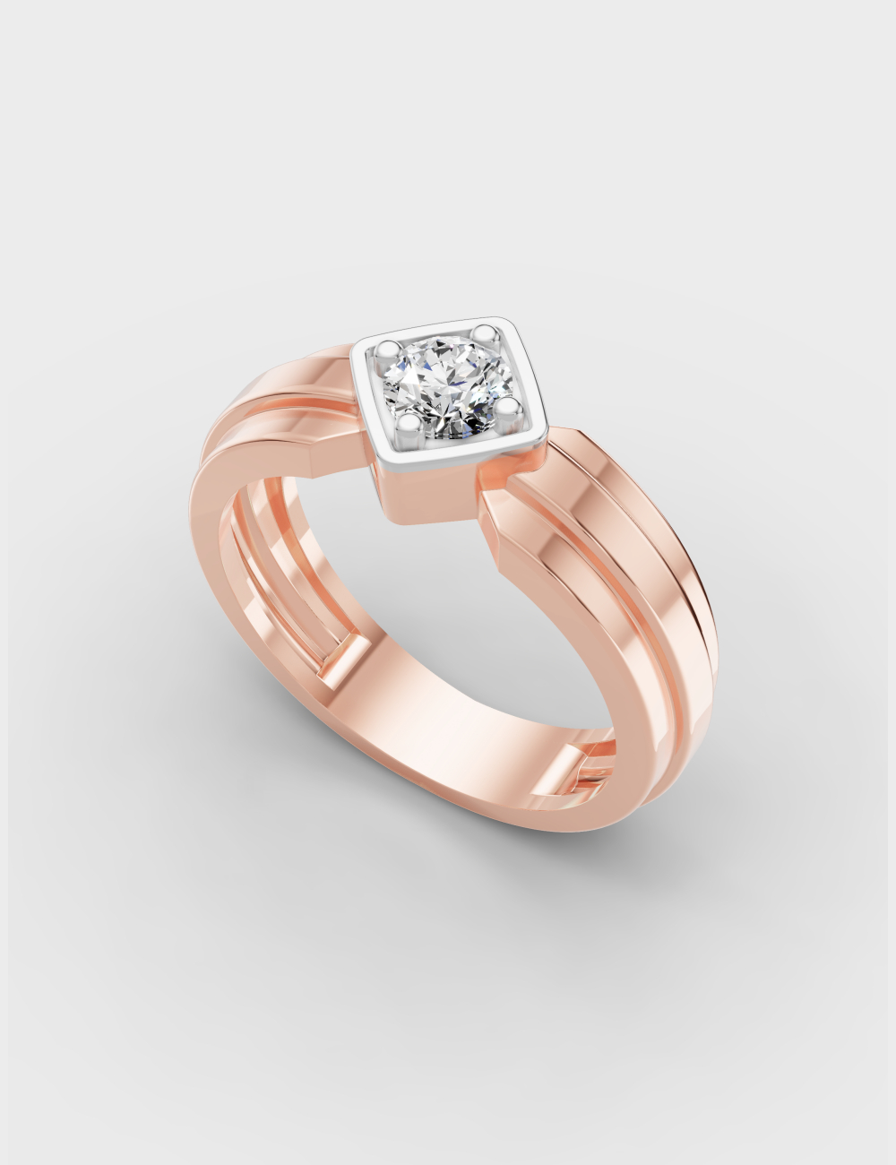 This bold 0.36-carat men's diamond ring features a radiant, centred solitaire-cut diamond and a sleek, modern design with sharp, angular lines. The distinctive band adds depth and complexity.