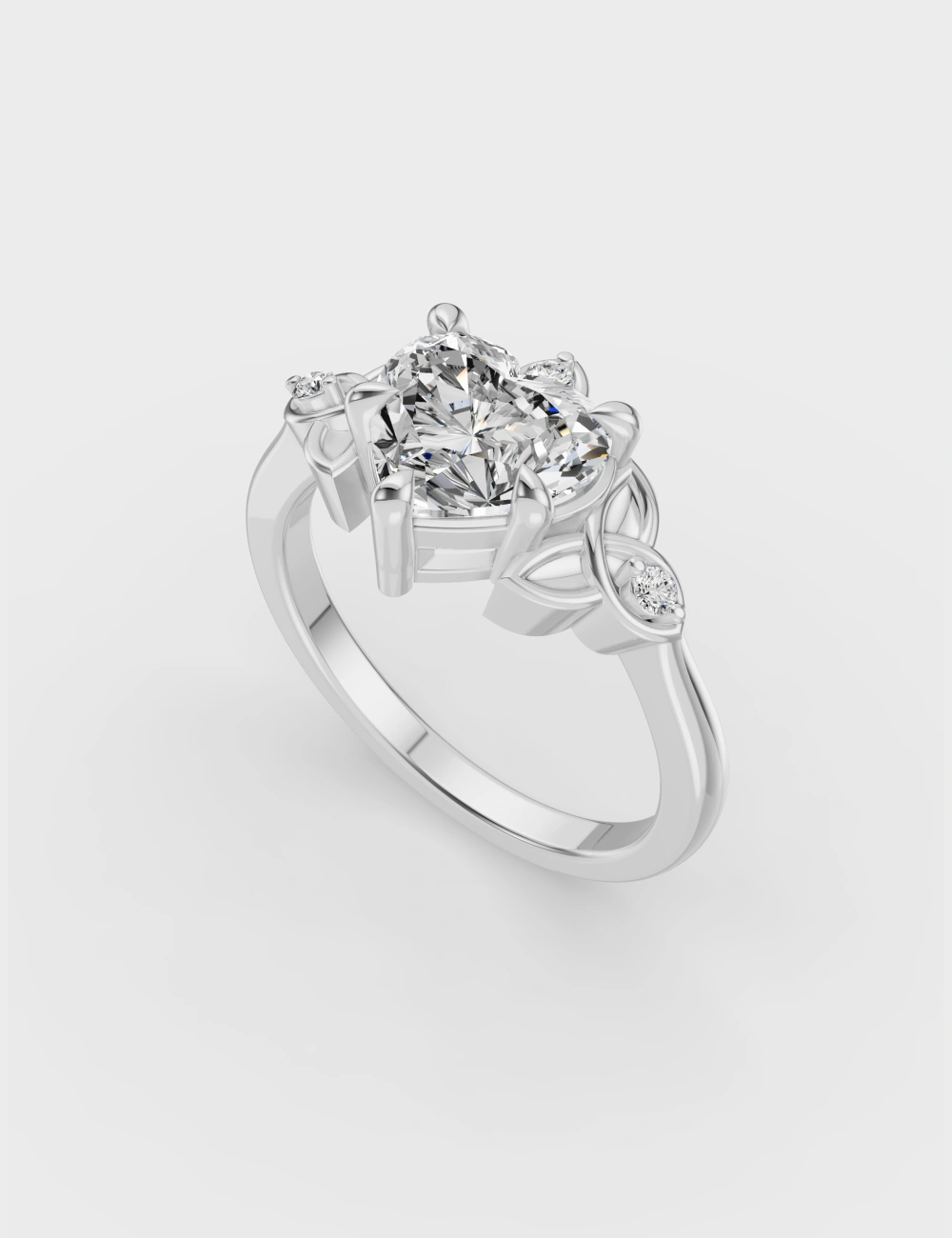 A heart-cut diamond steals the spotlight in this ring, framed by sparkling brilliant-cut accents. A stunner that’s made to be adored.