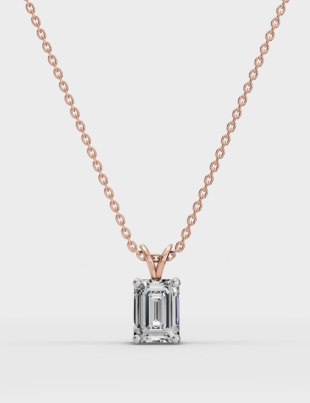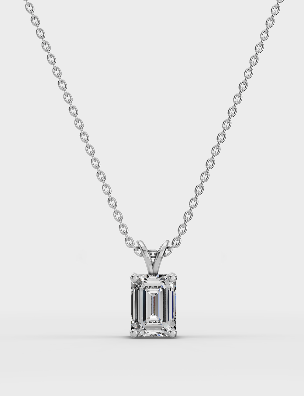 This expertly designed solitaire chain pendant creates a bold and visual statement with its fiery scintillation. The emerald-cut solitaire makes it an emblem of refinement and precision to dazzle all.
