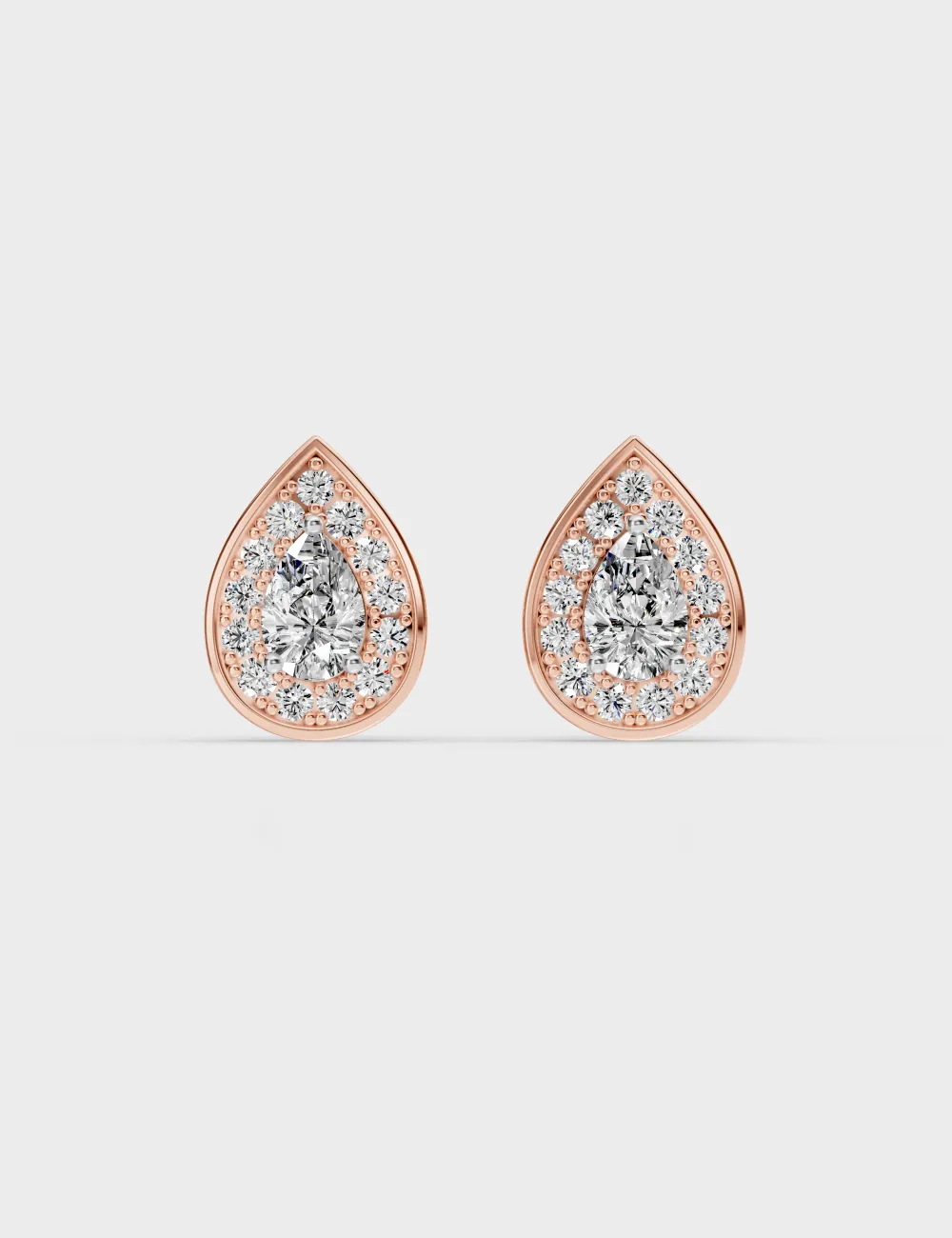 Designed for the woman who values exquisite diamond cuts, these pear solitaire studs feature a delicate halo of accent diamonds, forming a teardrop cluster that is both elegant and strikingly modern.