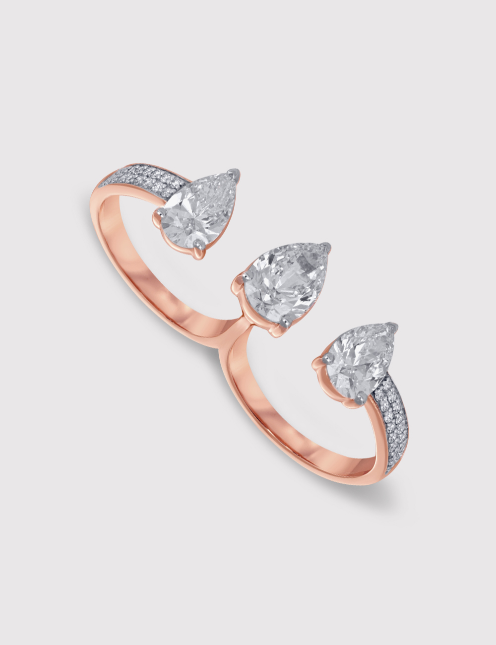 Bold yet refined, this double-finger ring showcases luminous pear-shaped diamonds on a sleek gold band. A contemporary expression of elegance, it turns every gesture into a statement of refined allure.