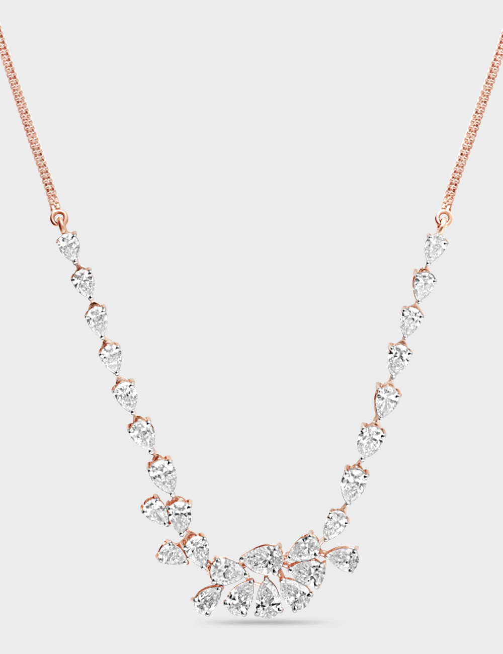 Refined and radiant, this diamond necklace encrusted with pear-cut diamonds elevates your evening elegance with its graceful cascade and fluid silhouette. Style it with a silk gown or an understated saree for a look that feels timeless, poised, and effortlessly sophisticated.