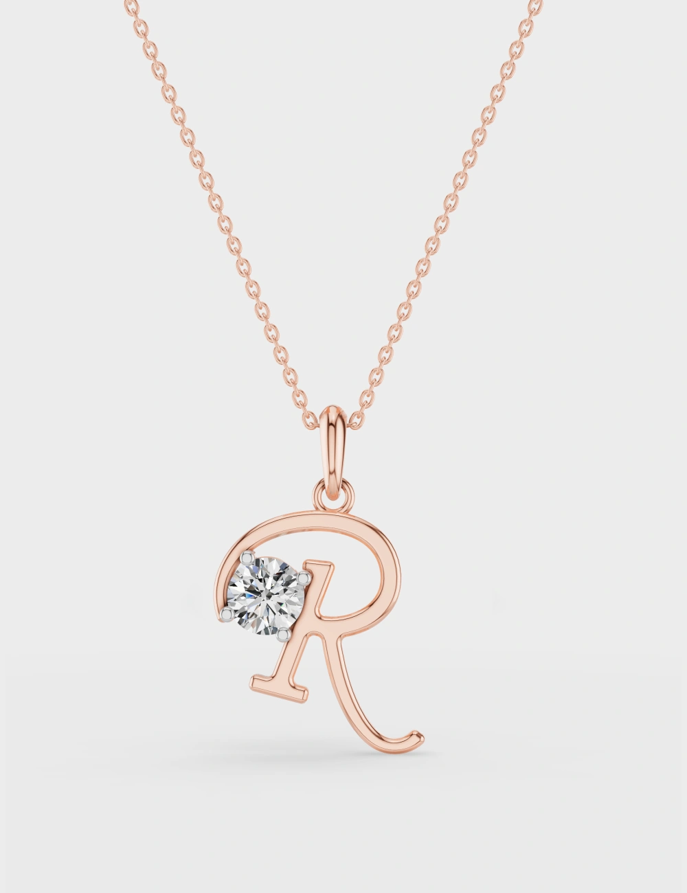 Elegance begins with a letter. A sculpted gold ‘R’, crowned with a brilliant diamond, designed to reflect your story with quiet luxury and lasting meaning.