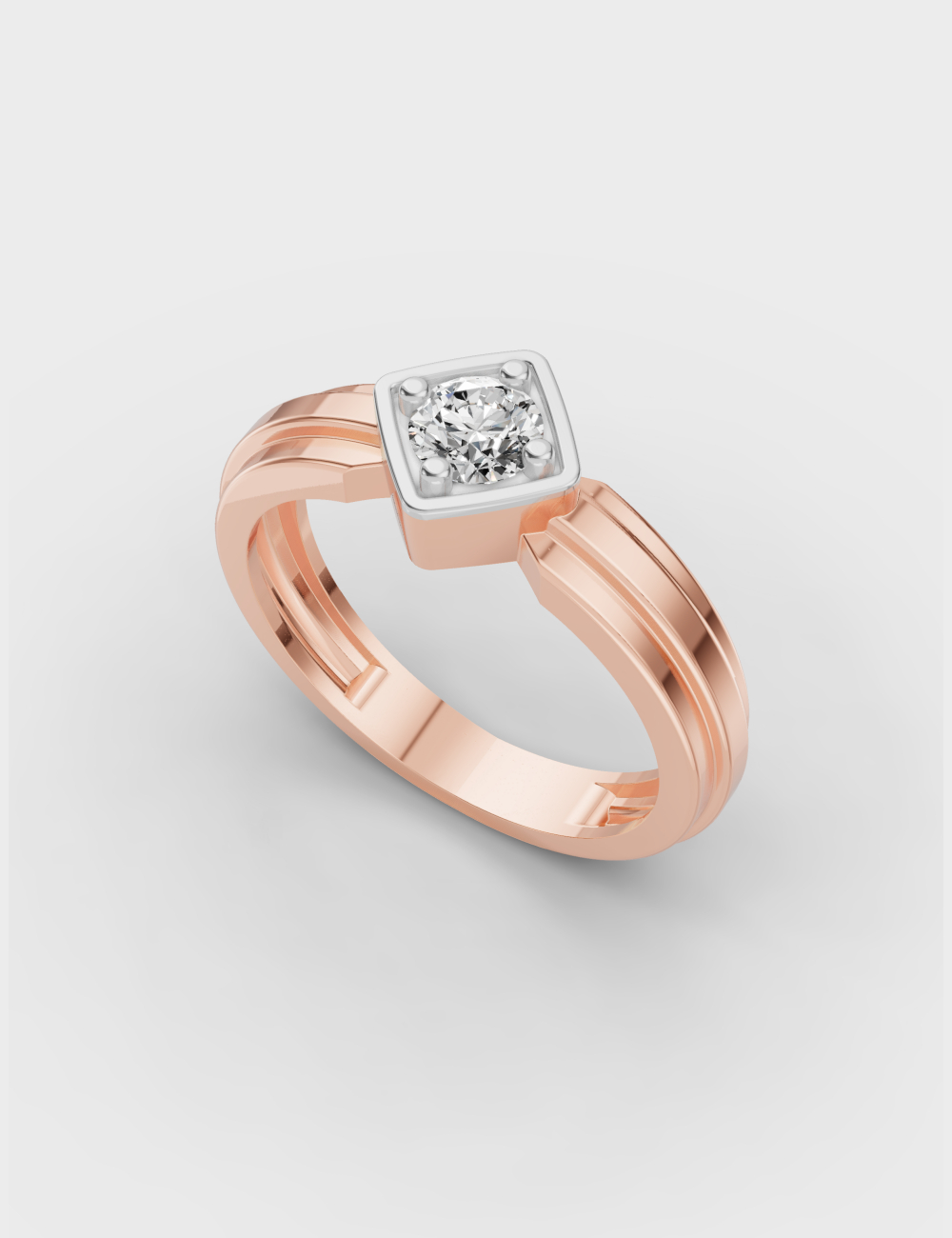 This visually appealing 0.8-carat men's diamond ring features a contemporary design with sharp lines. A brilliant-cut solitaire diamond takes centre stage, and the unique band adds depth and dimension to the design.