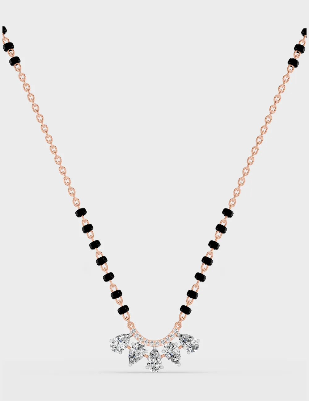 Aesthetically pleasing, this stunning mangalsutra features a cluster of inverted pear-cut diamonds forming a striking motif. The delicate design balances traditional elements with modern sophistication.