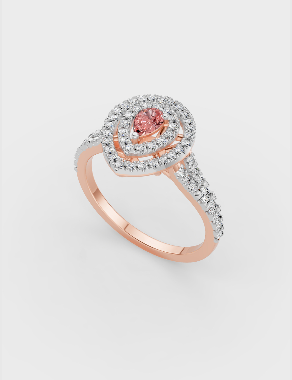 This elegant ring features a 0.66-carat centred pear-shaped diamond, gracefully framed by a double halo of sparkling diamonds. The design is both romantic and sophisticated.