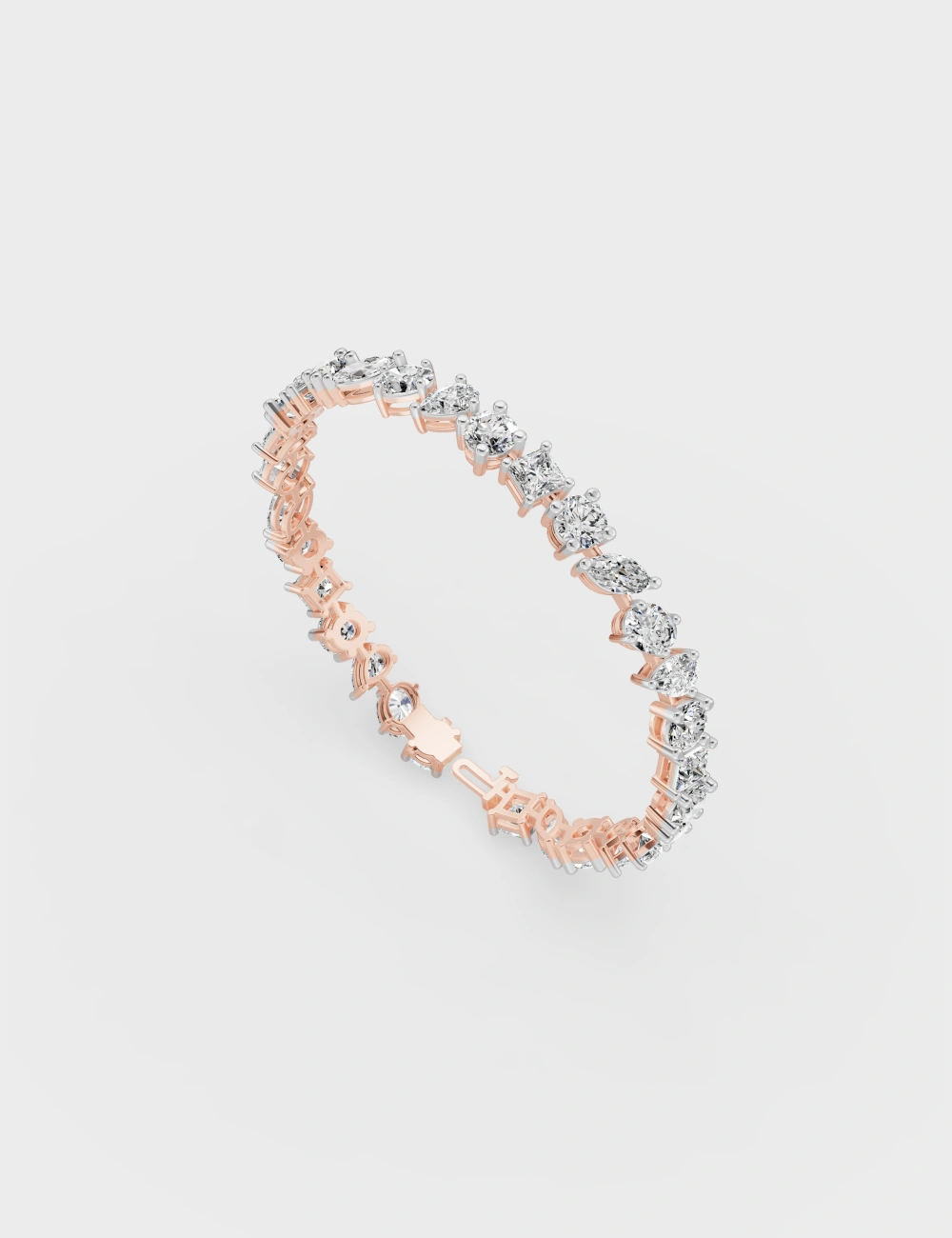 Make your mark with pure brilliance. This powerful statement bracelet showcases an array of exquisite-cut diamonds – pear, brilliant, princess, marquise, and oval – elevating your evening elegance.