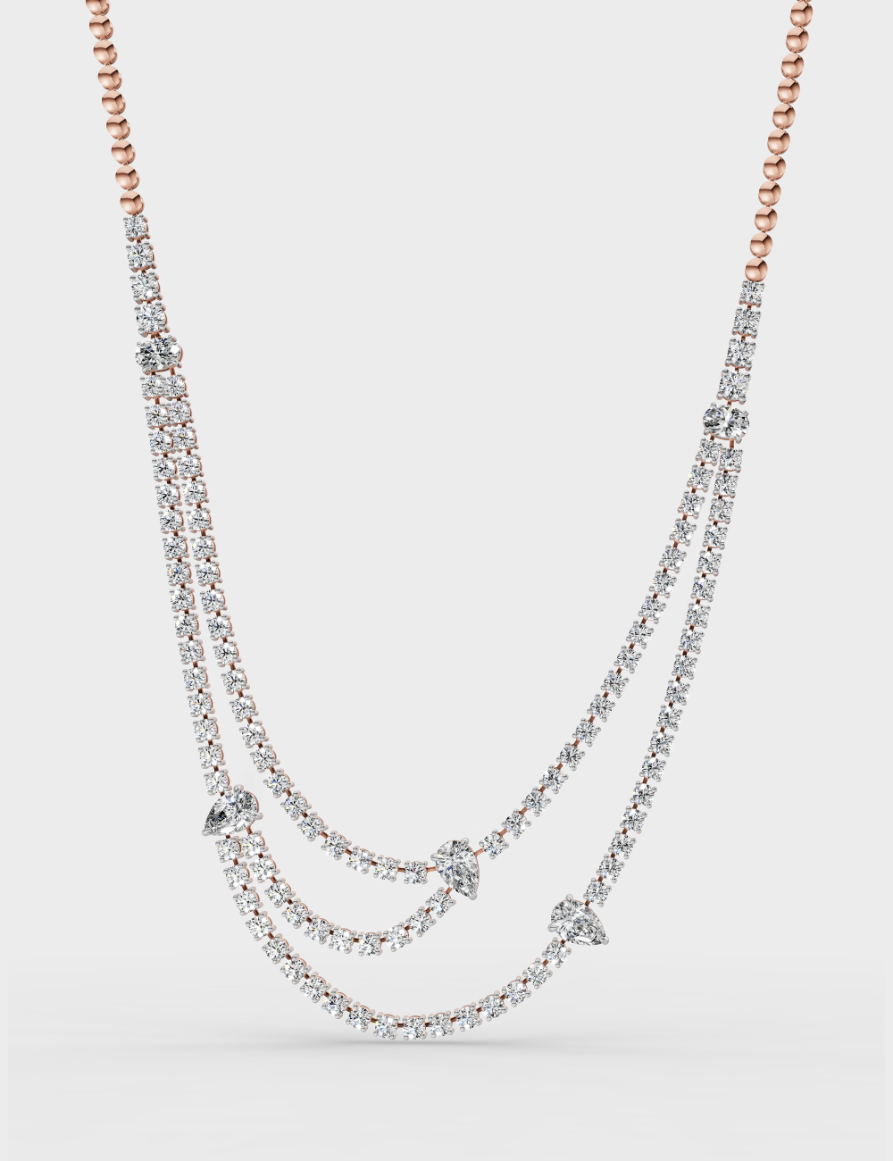 Unleash your inner diva with this mesmerizing dual-strand necklace, a masterpiece adorned with 19.46-carat oval, round and pear-cut diamonds. Every inch of this exquisite creation sparkles with unparalleled luxury.