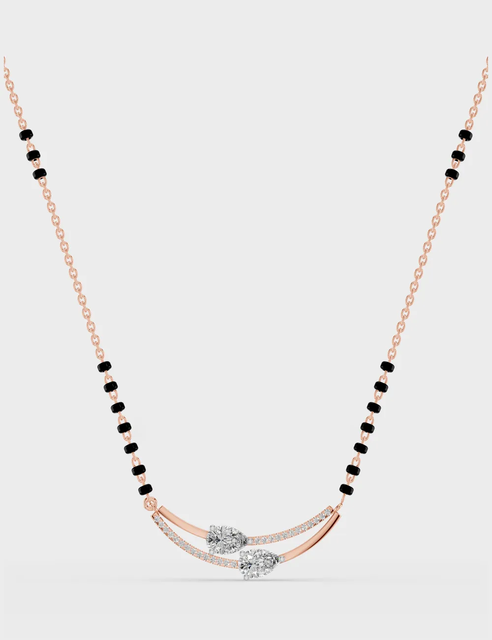 Step into your glow with jewellery that’s as unforgettable as you are. This mangalsutra pairs a sleek dual-strand black bead and gold chain with a pendant featuring two sparkling pear-cut diamonds, blending timeless tradition with modern elegance.