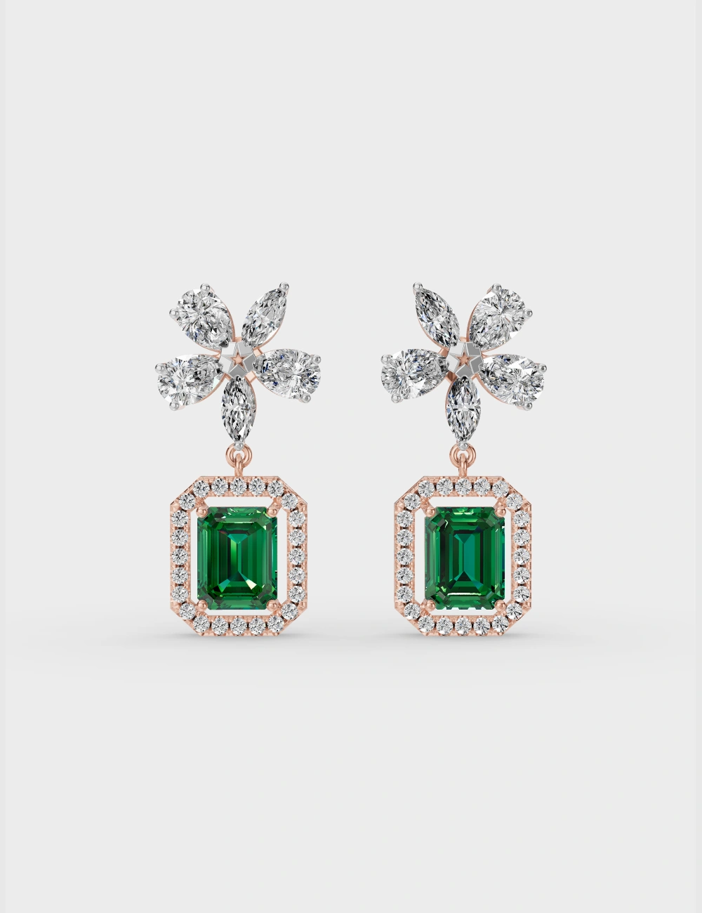 Nature meets glamour. Marquise-cut diamond petals bloom above a halo-framed emerald-cut centre. Playful, poised, and made to turn heads.